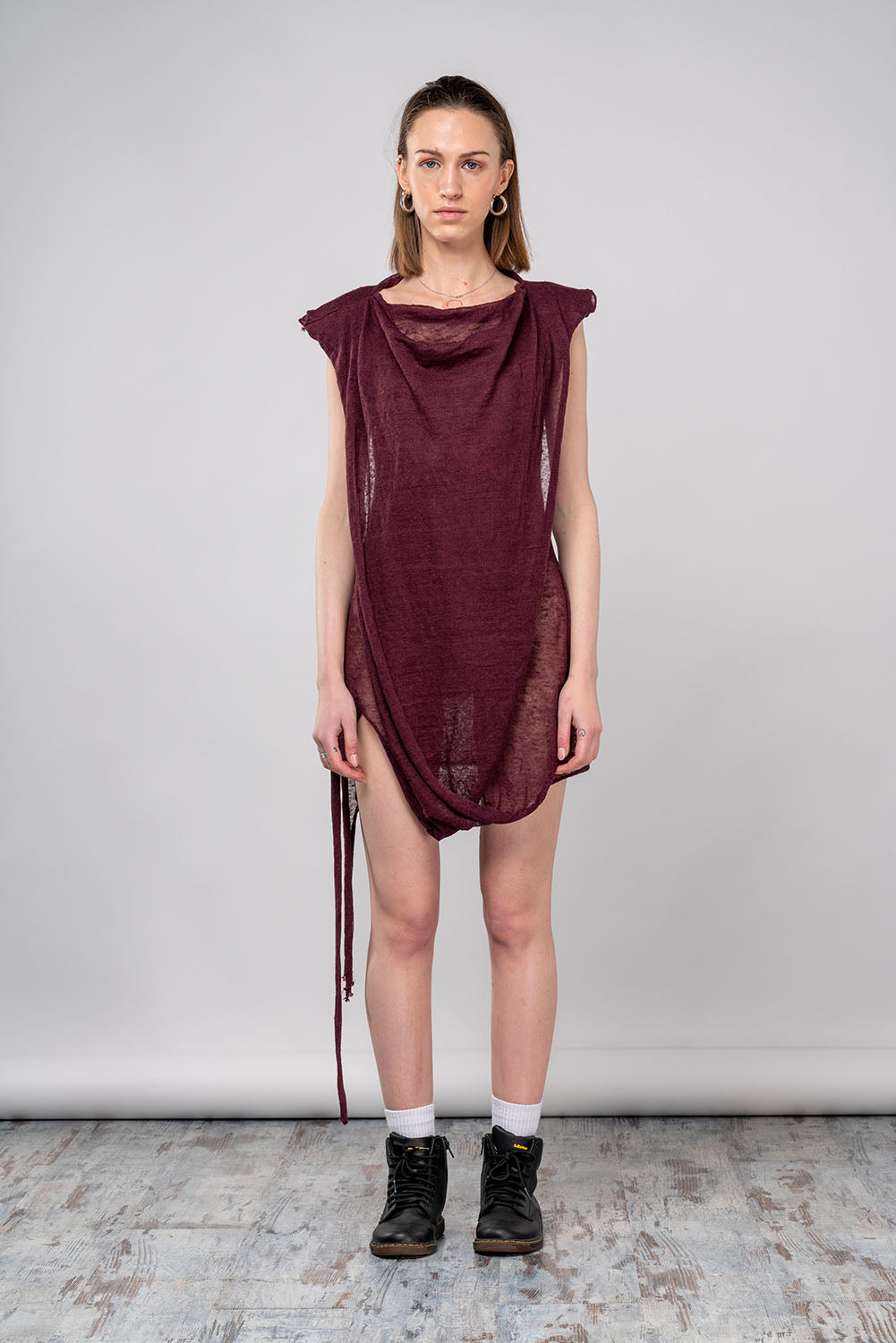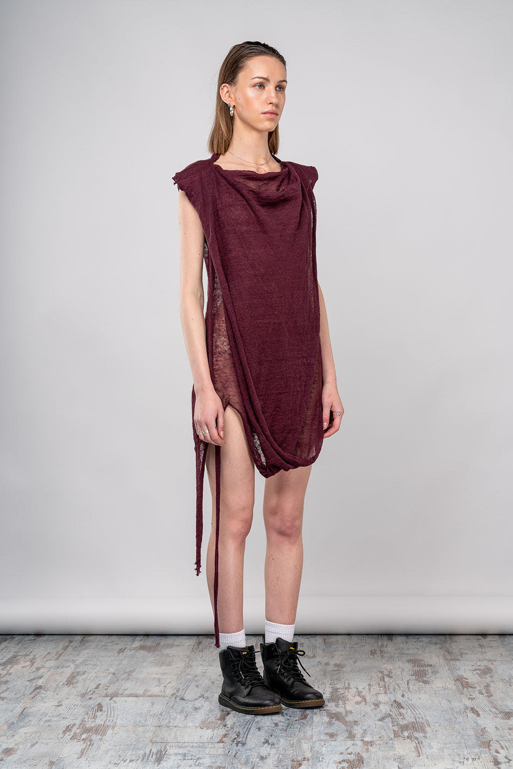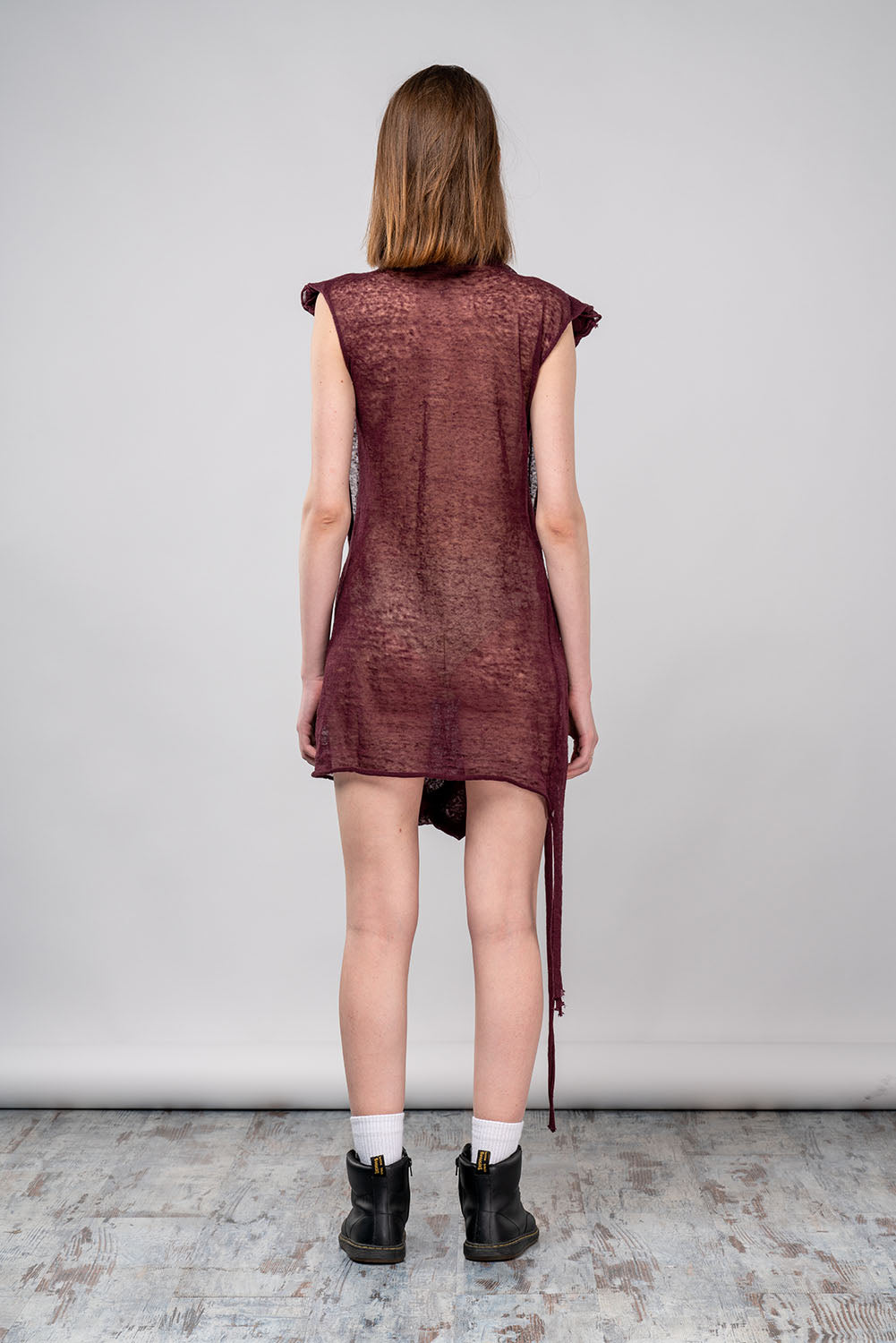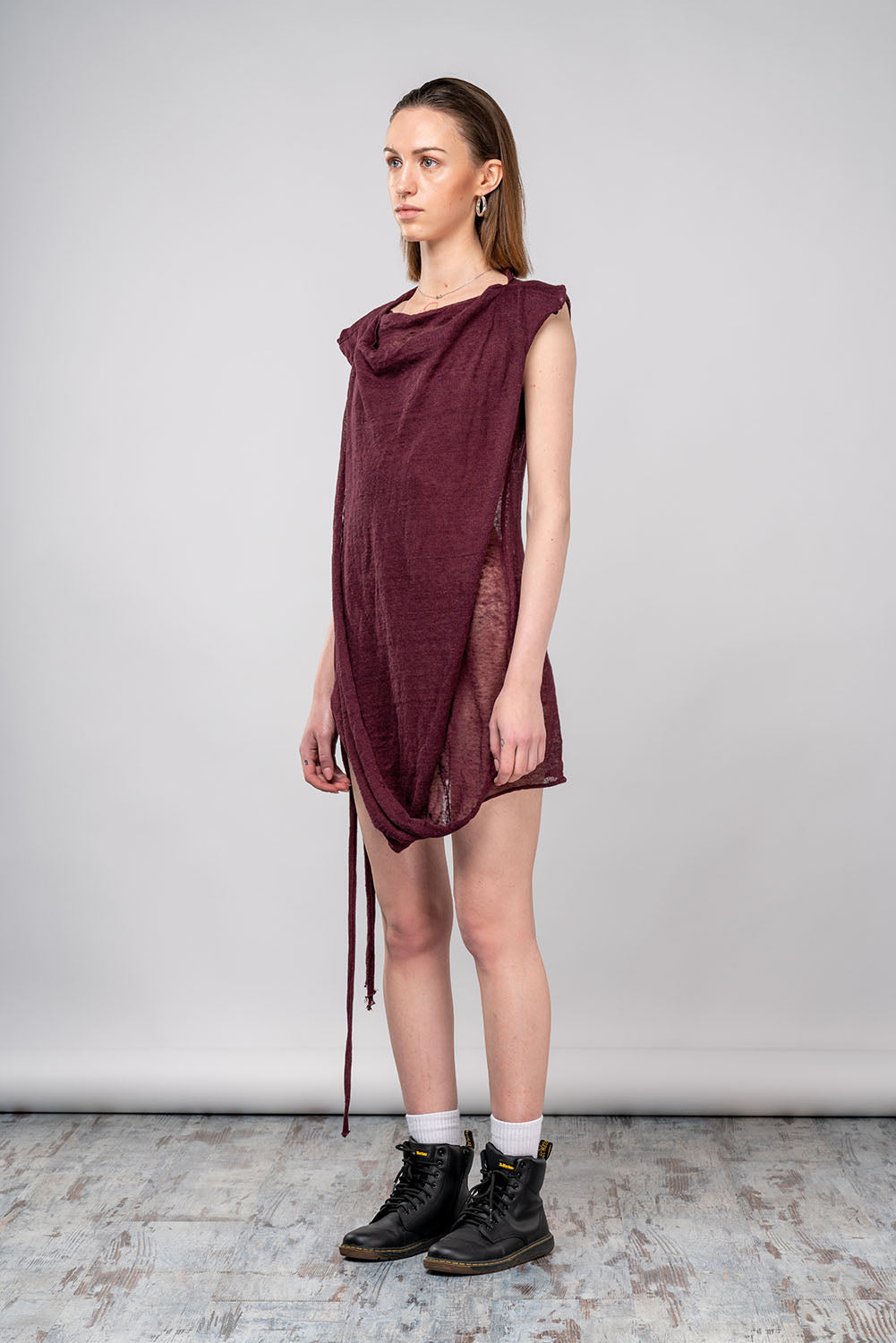 This sheer mini dress is made from a lightweight knit linen. There is a draped layer on the front with side strap and raw edge details.